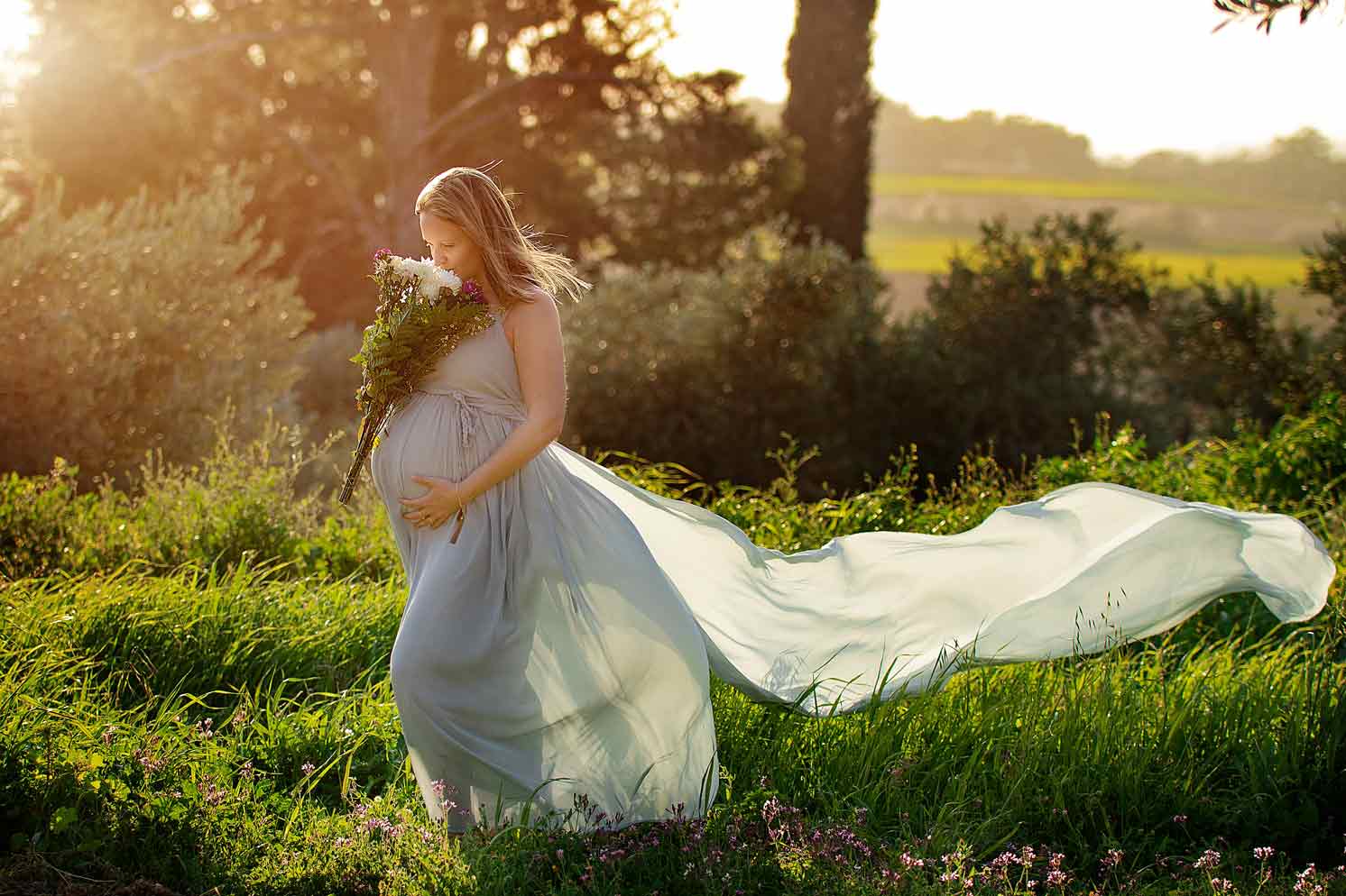 בצילומי הריון לא ממליץ על בדים פרחוניים עם צבעים מרובים.